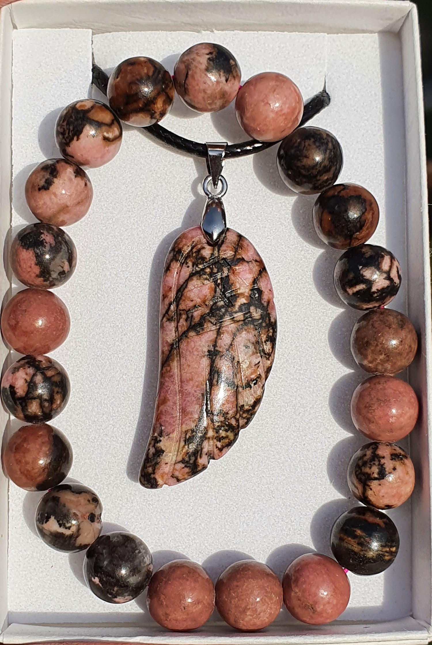 Gemstone Angel wing pendant & matching 8mm stretch bracelet set. Selected randomly