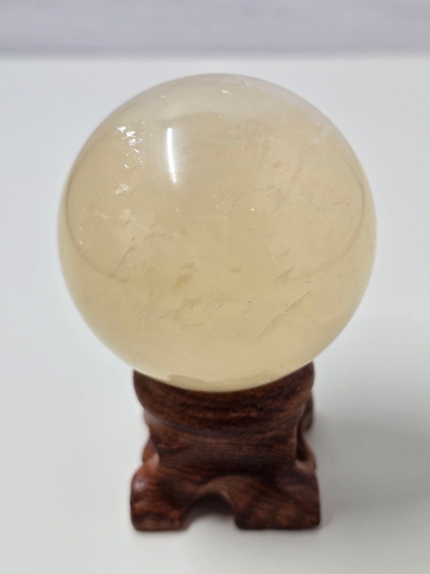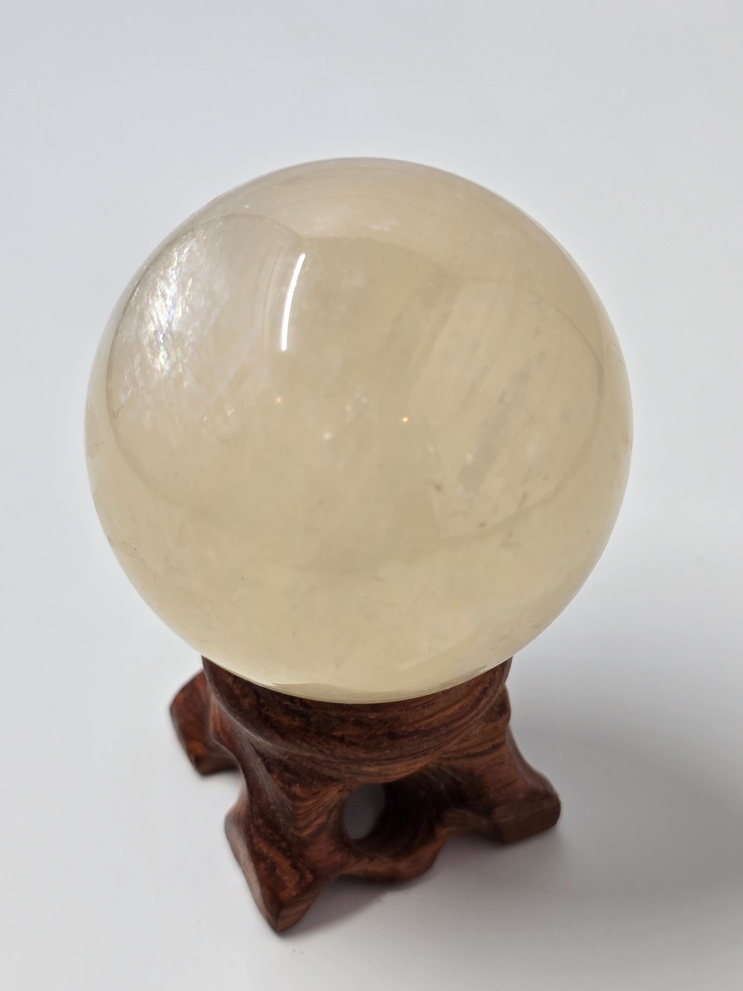 Beautiful Calcite sphere with wonderful flash. Calcite is a cleansing stone to assist clear the lower chakras and balance emotions to a more positive state.