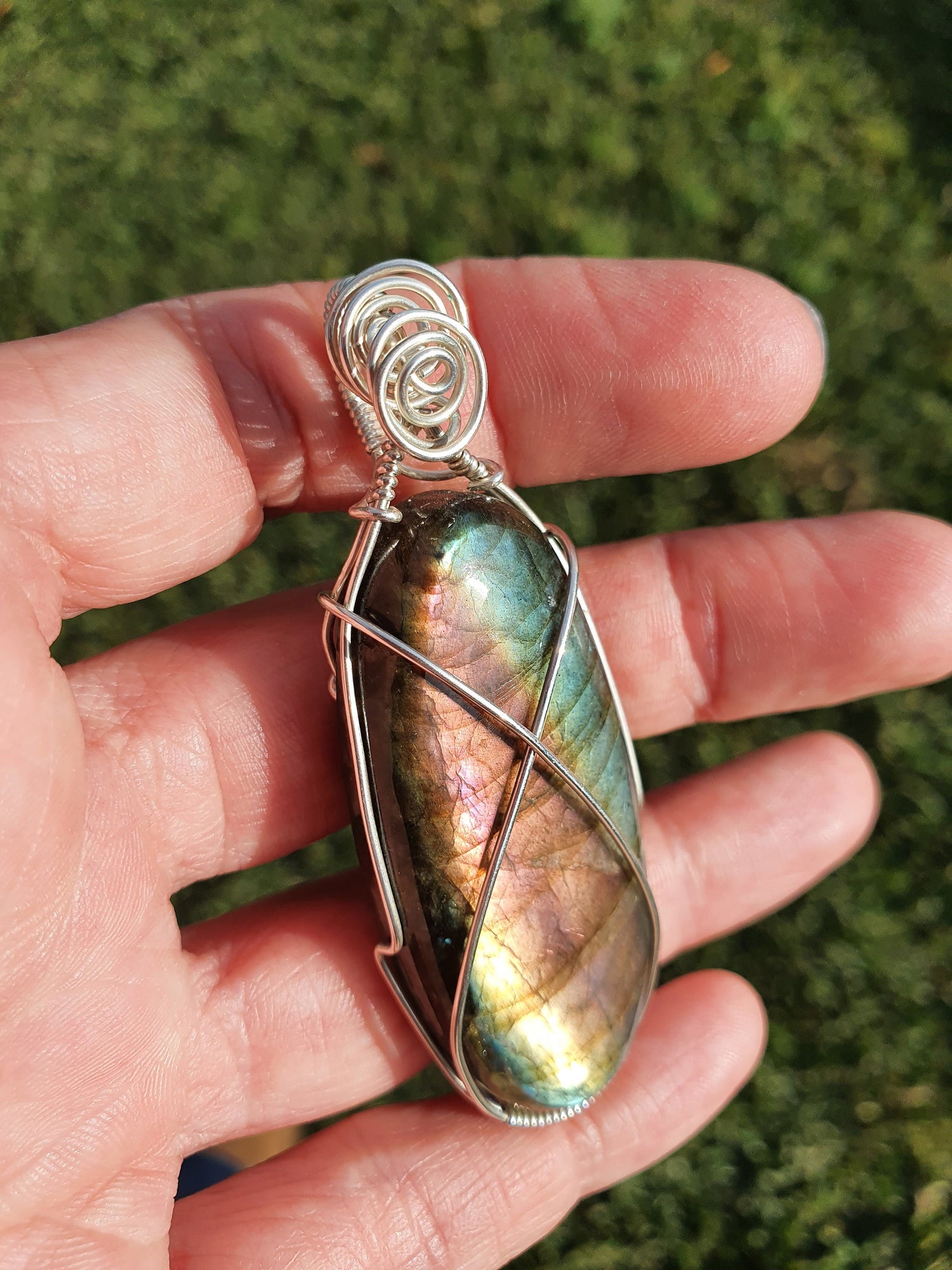 Multi coloured Rainbow Labradorite pendant. Wrapped in sterling silver wire with 50cm silver filled chain included.