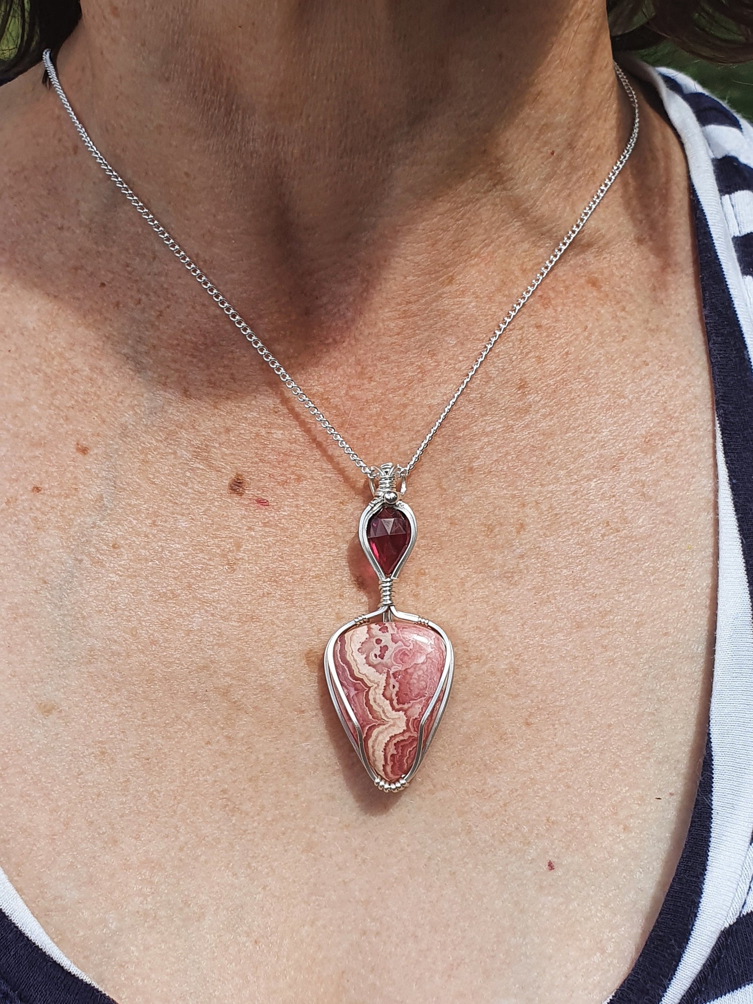 Rhodochrosite & Garnet pendant, set in sterling silver.