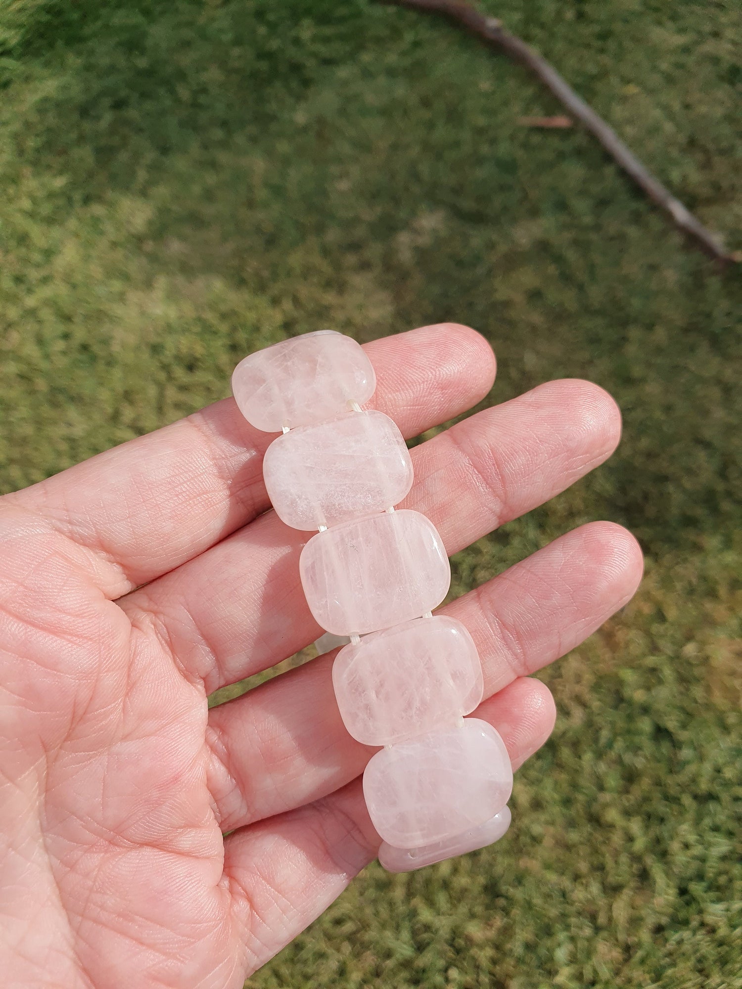 Unique flat carved Rose quartz bead bracelet. Threaded on stretch cord.